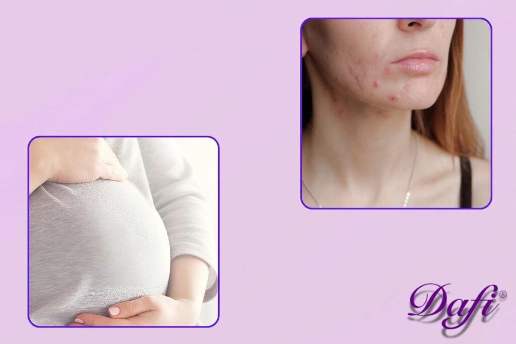 - آکنه و جوشهای بارداری: تغییرات هورمونی در بارداری، تولید چربی در پوست را بالا برده و منجر به بروز جوش و آکنه میشود. این مشکل بارداری و پوست صورت، بیشتر در سهماهه اول بارداری رخ میدهد.